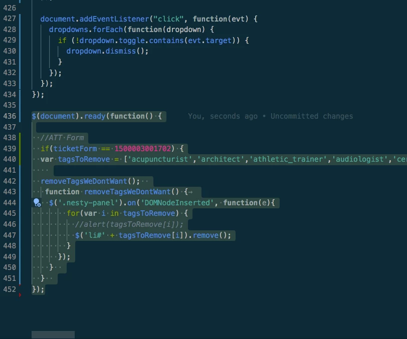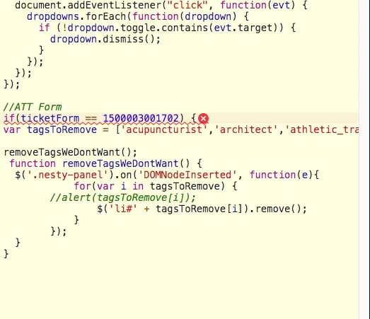 We currently have customizations in our script.js file to support some of our ticket forms. On initial load of the ticket forms everything works great in terms of the custom code doing what it needs to do. However, after a validation error on a ticket form submission the entire ticket form reverts back to a way where it did not run through our custom code. In the example below when ticket form first loads it shows just four professions in the dropdown (we are hiding certain dropdown items) and after a validation error it reverts back to showing all professions in the dropdown. This happens for all customizations so it appears like it's not saving the state of the page. Any help is appreciated in attempting to resolve this. Thanks!