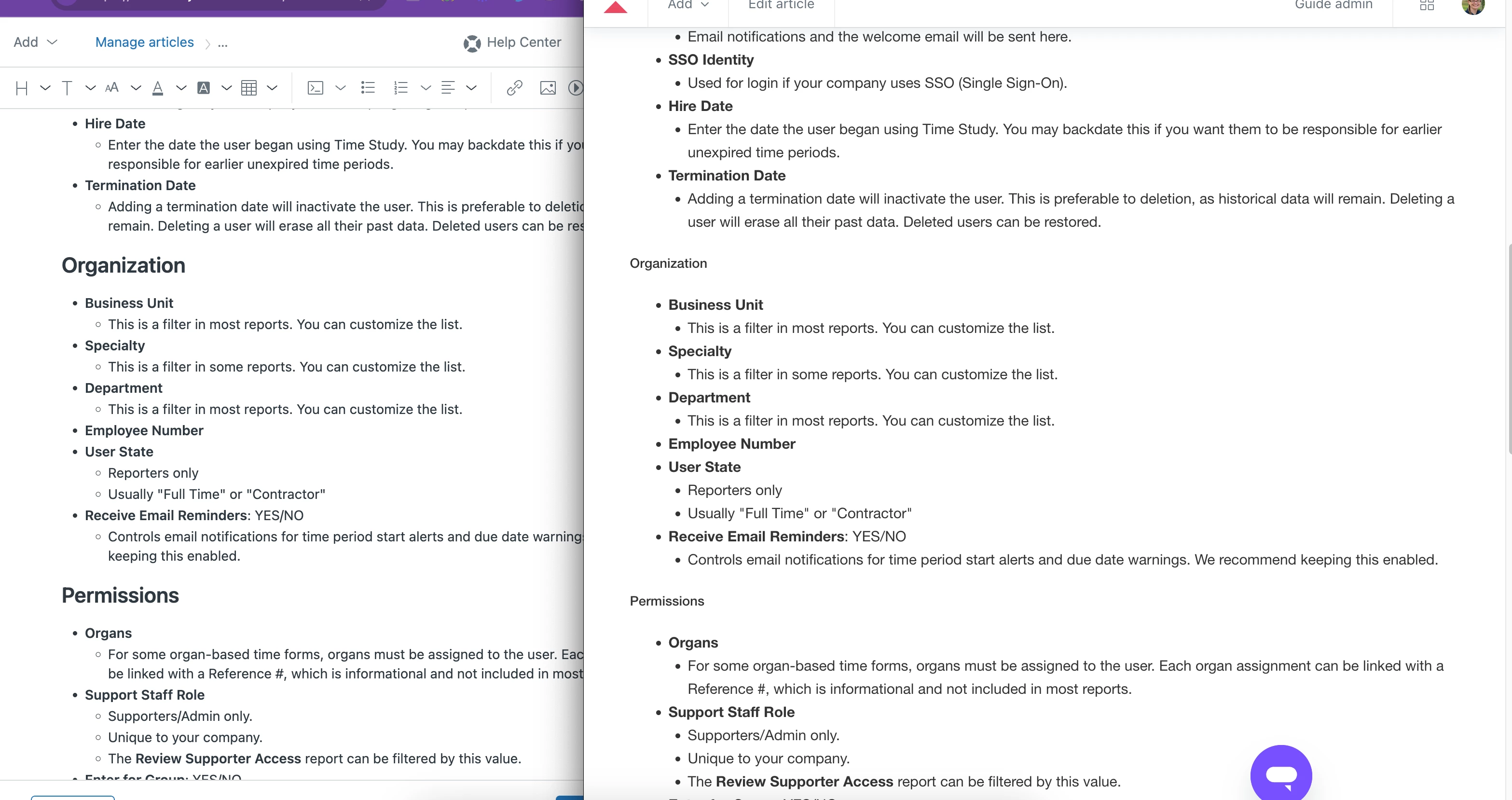 Editor view on the left, published view on the right. Look at the headers “Organization” and “Permissions”.