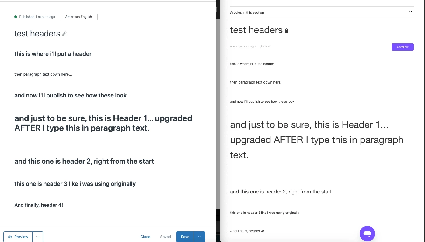 I'm breaking out an existing article into a few different sections, and each section has a header (Header 3), and they look right in the editor view, but when published, they appear to be the same size as regular paragraphs.