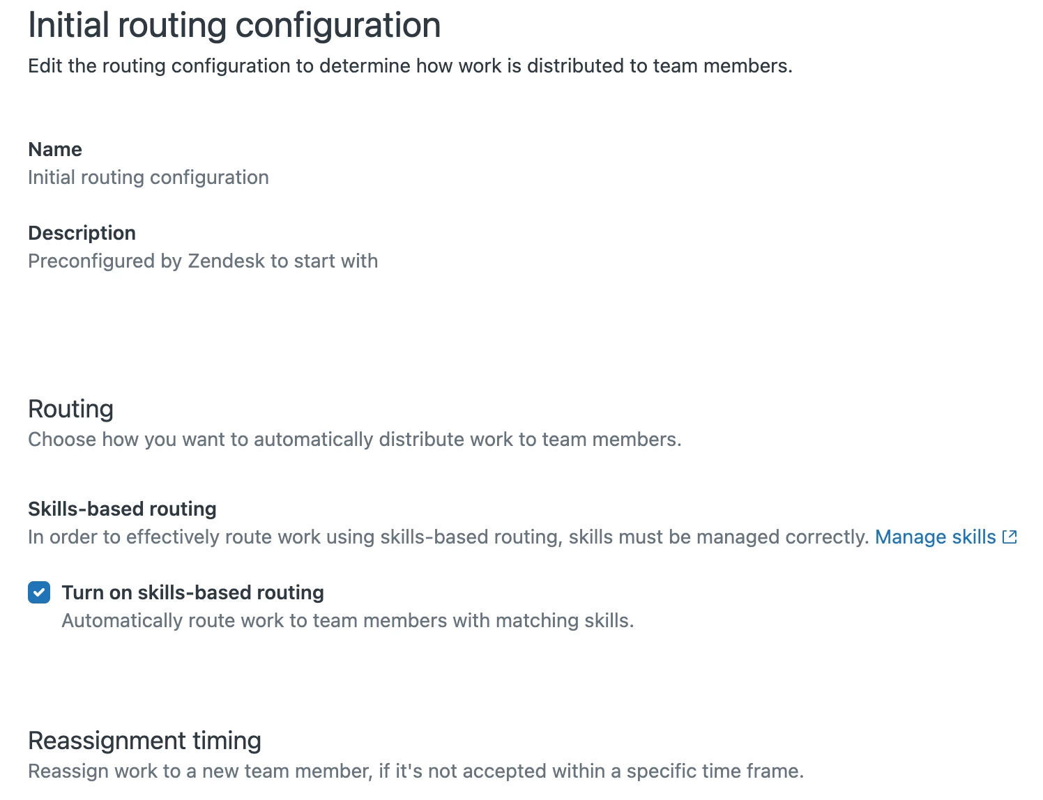 Once the EAP is applied to your account, you will see a checkbox in your routing configuration screen. It will be be off by default. Before switching it on, you should confirm that you have the correct skills setup, that your agents have been assigned the correct skills and that you have the correct skills rules which will add the skills to tickets. See here for more details on best practices on setting up skills.