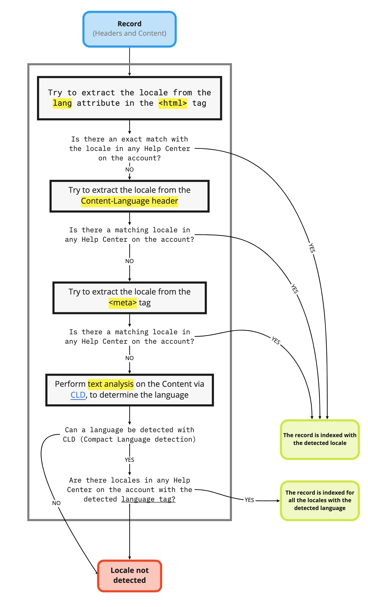 In order to show the correct external results for the right Help Center searches, the crawler determines the locale or language of the external page and maps it to the corresponding Help Center by looking for language tags on the page and if nothing is found we utilize a language detection program known as Compact Language Detection (CLD).