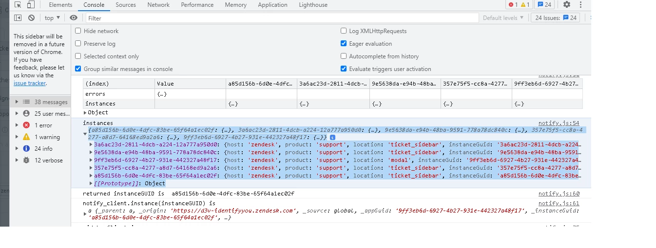 I would like to get current sidebar app instance, when the control is in modal for triggering the method in sidebar app which will send the required information to modal. But as client.get(instances) returning all the previous sidebar app instances, I wasn't able to get the current instance GUID. Is there any method to clear the instance once the it was closed or moved to another ticket.
