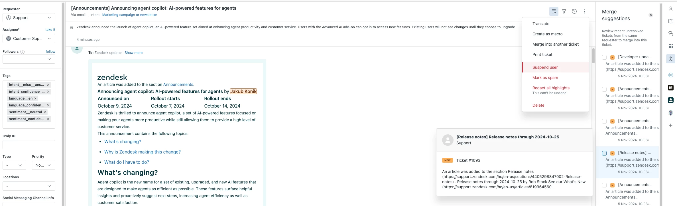 Here is an example for Agent Copilot (one of the recent AI Summit announcements), using Retail intent; this also shows the new agent copilot experience which includes Merge Suggestions - please note Similar tickets are now located in the search bar in Agent Workspace (Intelligence panel no longer exists, Intent is also located in the ticket header). Zendesk AI Summit Deep Dive is also available with a lot of Q&A info and great Event Resources (like demos) as well.