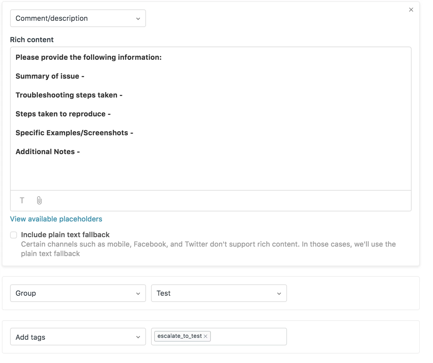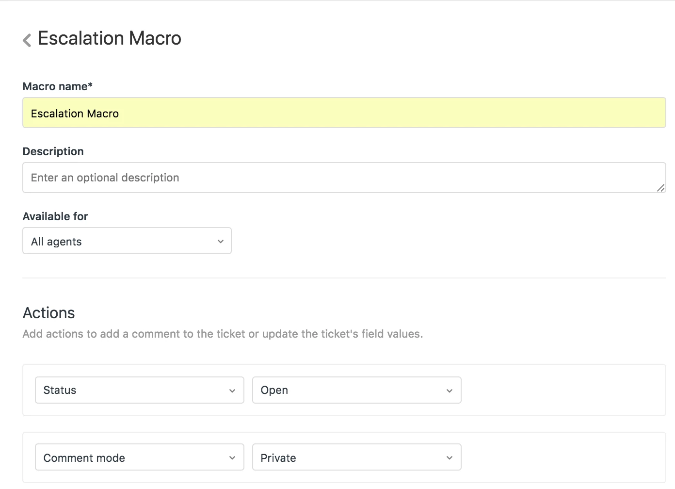 Apply macro - agent applies macro to ticket when escalation is necessary, filling out the appropriate information and submitting as open. Macro serves as a friendly reminder of the information needed to escalate.