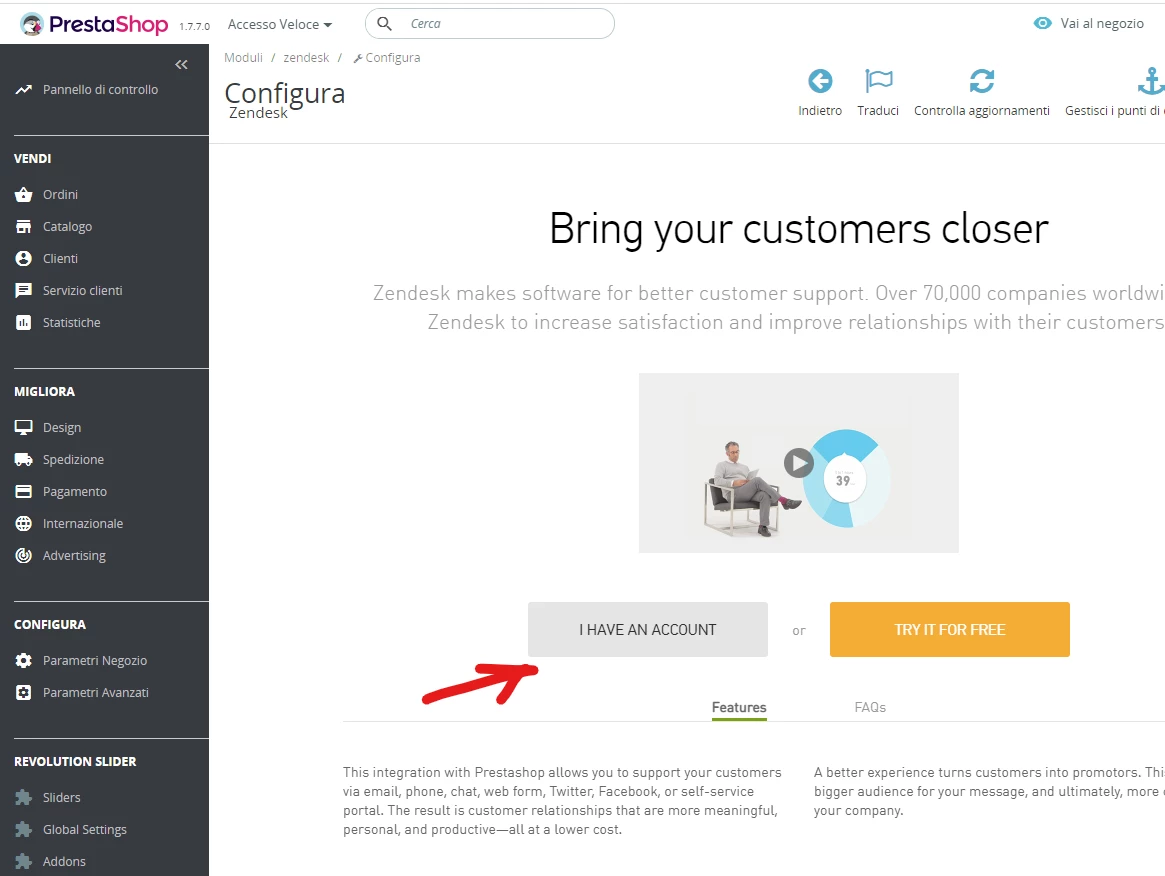 In Prestashop I've installed the official plugin, but when I select the configuration "I have an account", nothing happens, and I've no way to configure the integration with Zendesk.