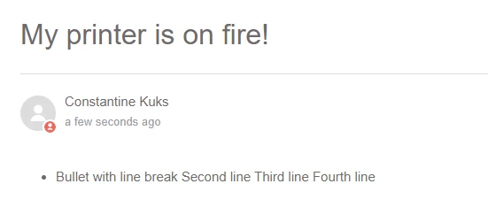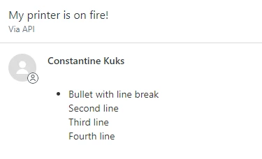 "body": " * Bullet with line break\n Second line\nThird line\nFourth line"