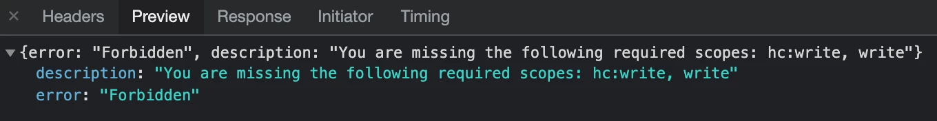 When opening our integrated Web Widget and clicking to expand a Help Center article, in the console we get a 403 error with the following message: "You are missing the following required scopes: hc:write, write"