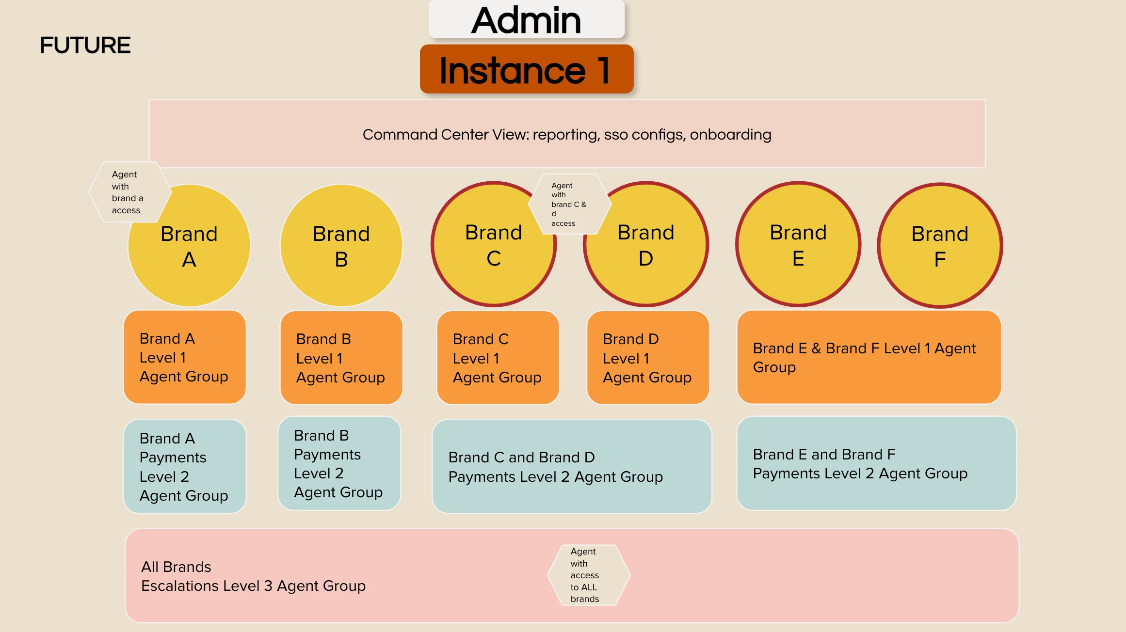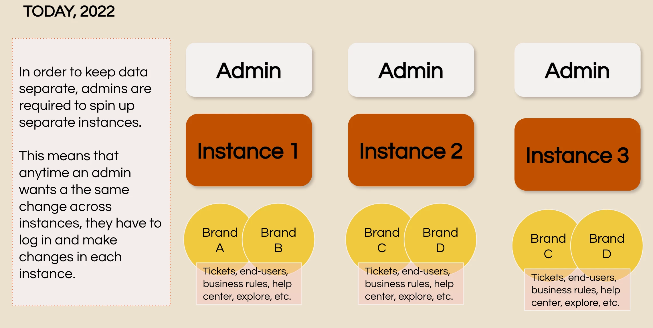 Here's how Zendesk is (roughly) setup today. Each instance has an admin, each brand shares everything with other brands within that instance.