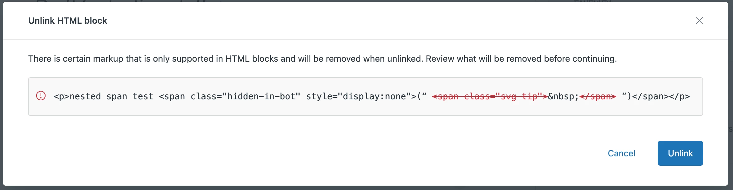 In the new editor, using nested <span>s turns the content into an HTML block. Is this the intended functionality? It seems odd to me since <span>s are supported HTML.