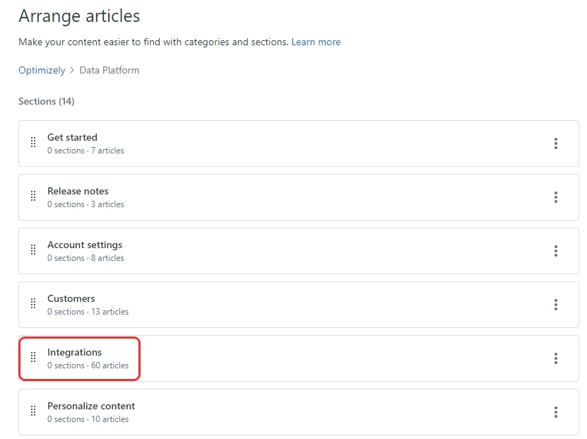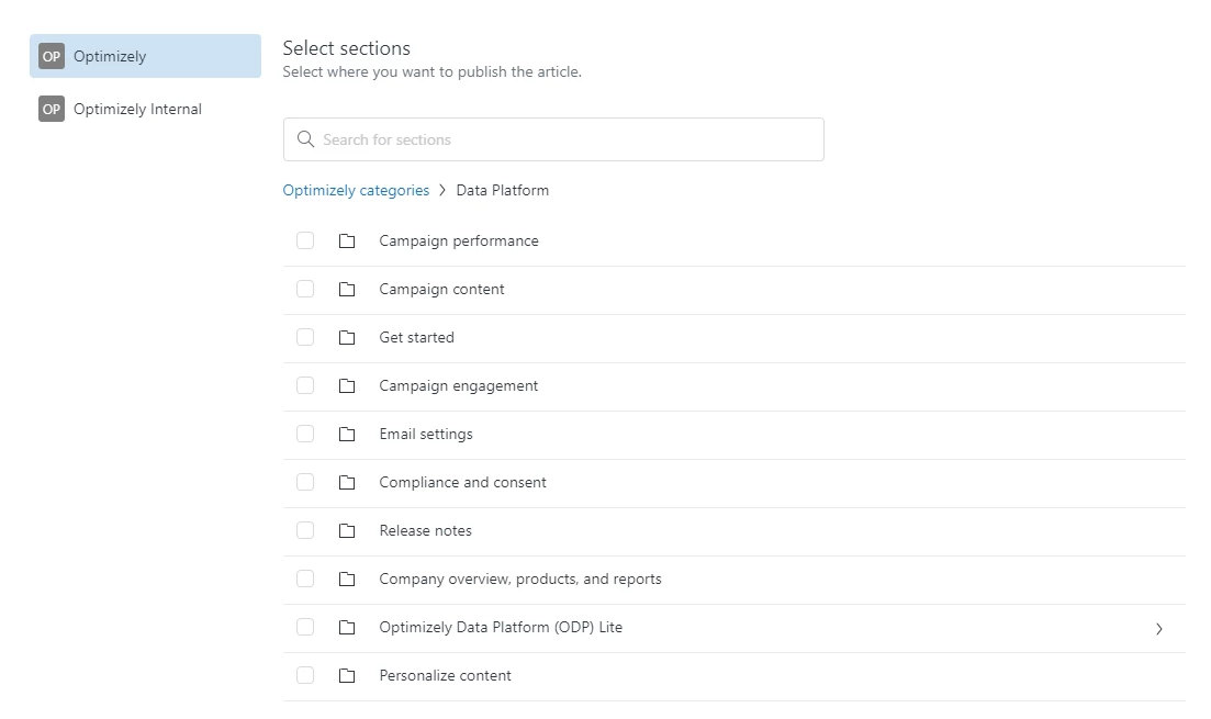 We ran into a bug where we are trying to place an article within a specific section, but it is not showing up properly in the selection module (in this case, Integrations section).