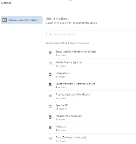 I clicked Add > Article in Mediaocean UK & Ireland, selected the placement, which was in Mediaocean UK & Ireland only, clicked Done, and then Save. Next, I clicked Manage sections to add more placements. But only Mediaocean UK & Ireland shows as an option. See screen shot. I don't know if this is by design. But I would expect to see all Zendesk regions (brands) to select where I want to add the additional placements.