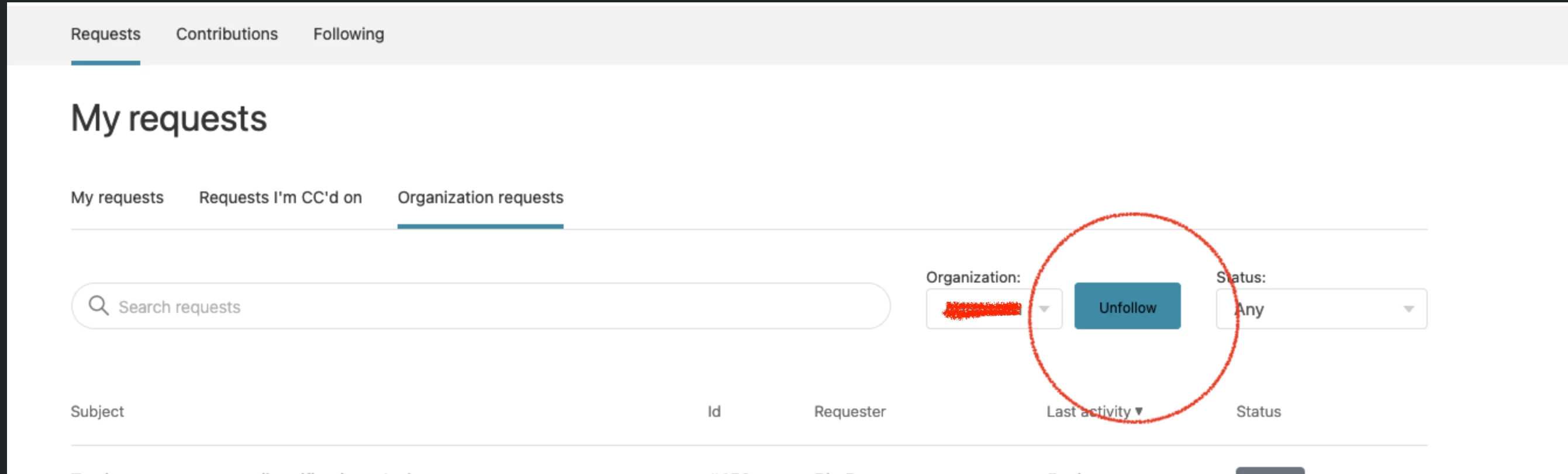 There is a "Follow" button under Requests/Organization request.