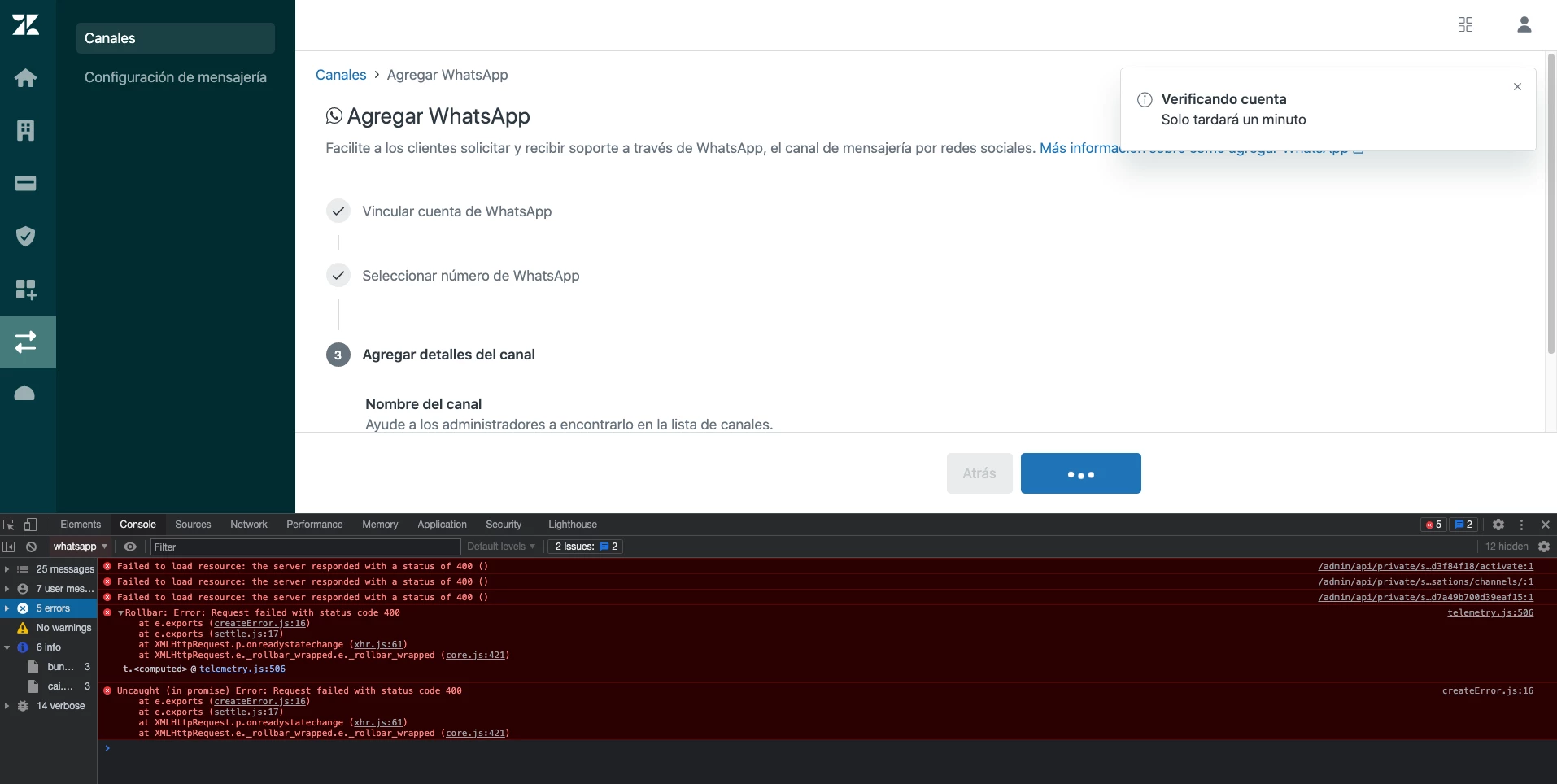 Estoy con un problema al dar de alta el canal de whatsapp, todos los pasos por facebook son correctos, seleccione el número y el nombre y luego no avanza de la pantalla de alta.
