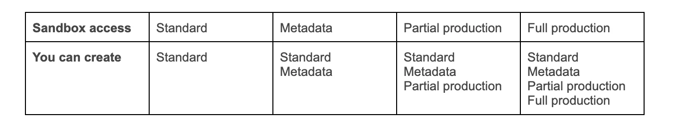 Until now, if you upgraded to any type of Premium sandbox (metadata, partial production, or full production), you could only create that one type of sandbox. Not anymore! We’re excited to make all lower types of Sandboxes available to Premium Sandbox customers.