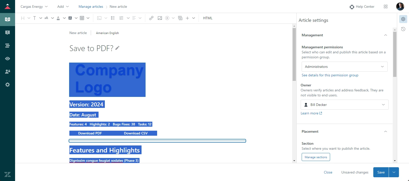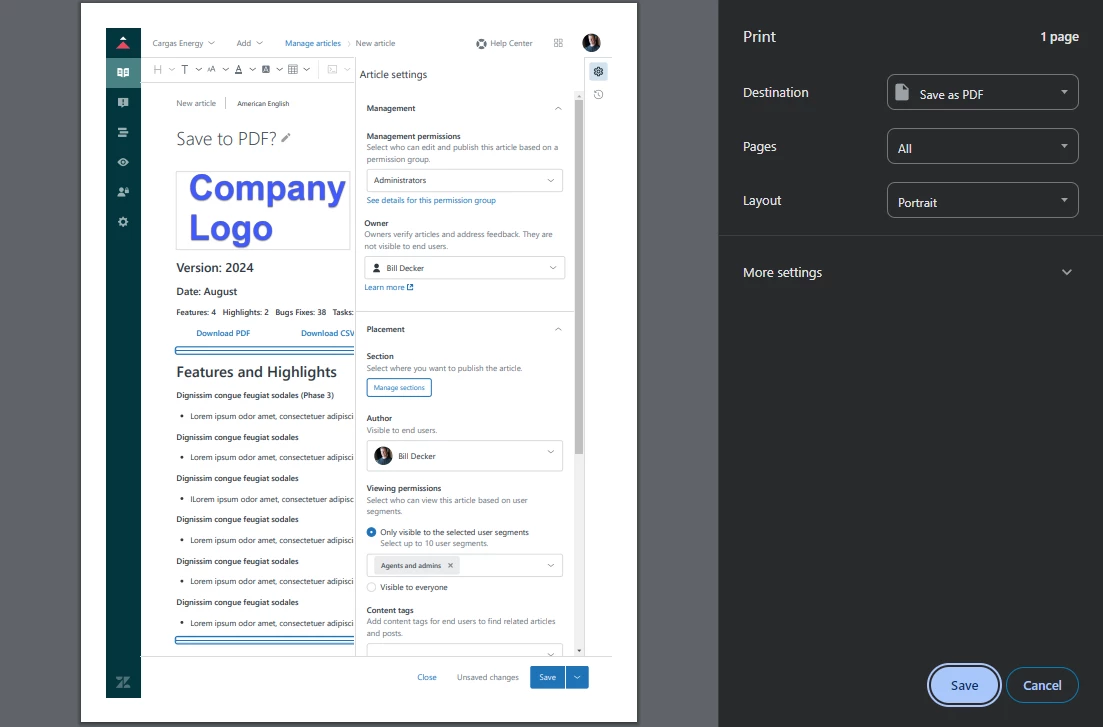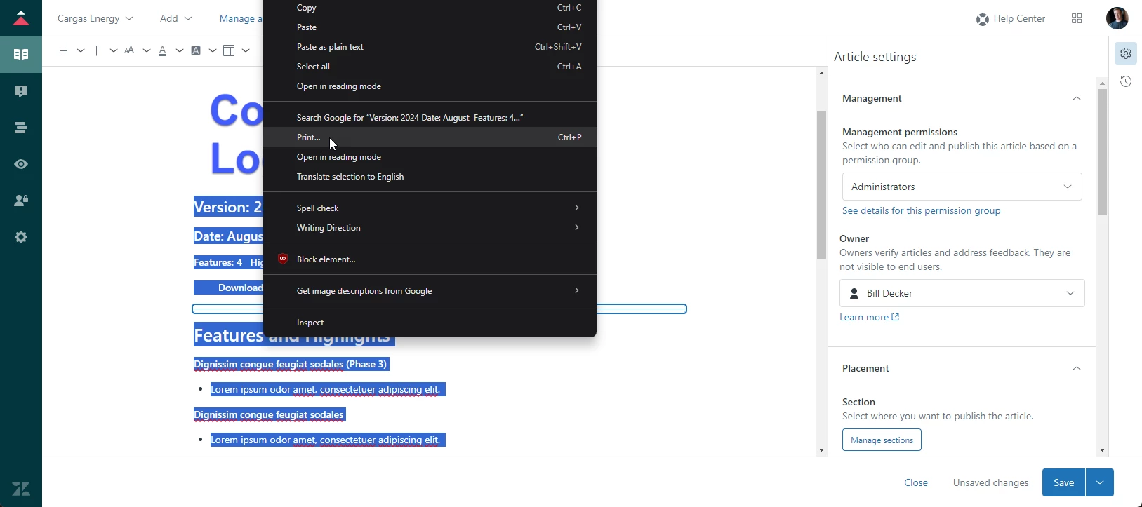 Previous method: We have collapsing tables that display all text in the editor, but not in the KB view. We would highlight all text of the article in the editor > Ctrl + P > Save to PDF to generate a PDF of just the text and graphics from the article.