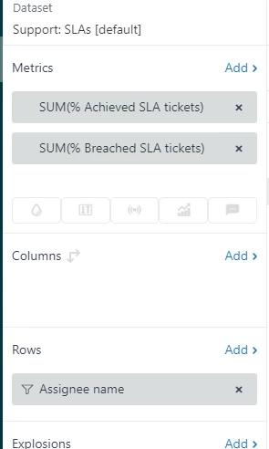 In Explore, I have my own query and based it on the "Support: SLAs [default]" - I feel like I've taken initial steps but have hit a wall. I was able to pull up "% achieved/breached SLA tickets" (in Metrics) and "specific agents" (in Rows), but there are still things that I can't choose/filter by:
