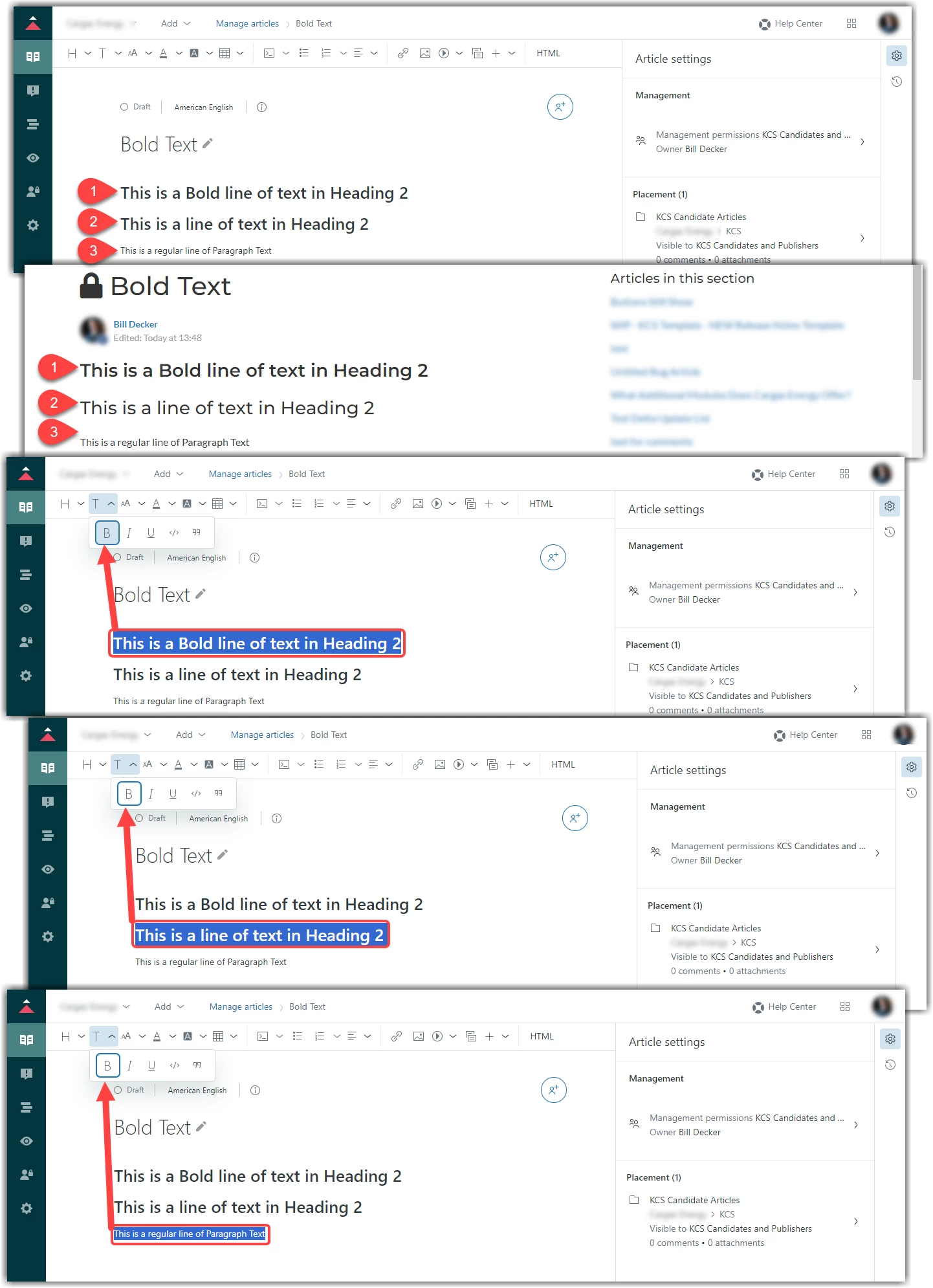 Formatting options for text, when choosing to Bold, Italicize, or Underline, are hidden from view and you are unable to tell which headers are bold in the Editor view. Even when you select the specific text, it is confusing when trying to check if it is Bold. It appears bolded text is designated by a highlighted B icon in the Text Formatting dropdown, yet when selecting unbolded text, the B icon shows as outlined. This is confusing when trying to spot check formatting from the editor. It would be great if the Text Formatting Options were returned to the toolbar and not in a dropdown.