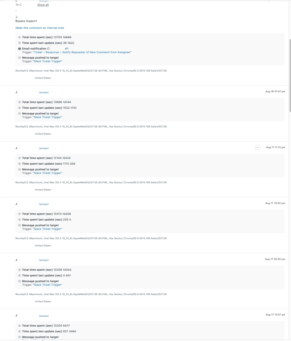 As shown in the screenshot below, I've come across tickets where there are multiple ticket updates with just details from the time tracking app. In spot-checking, I've seen this with a couple of agents.