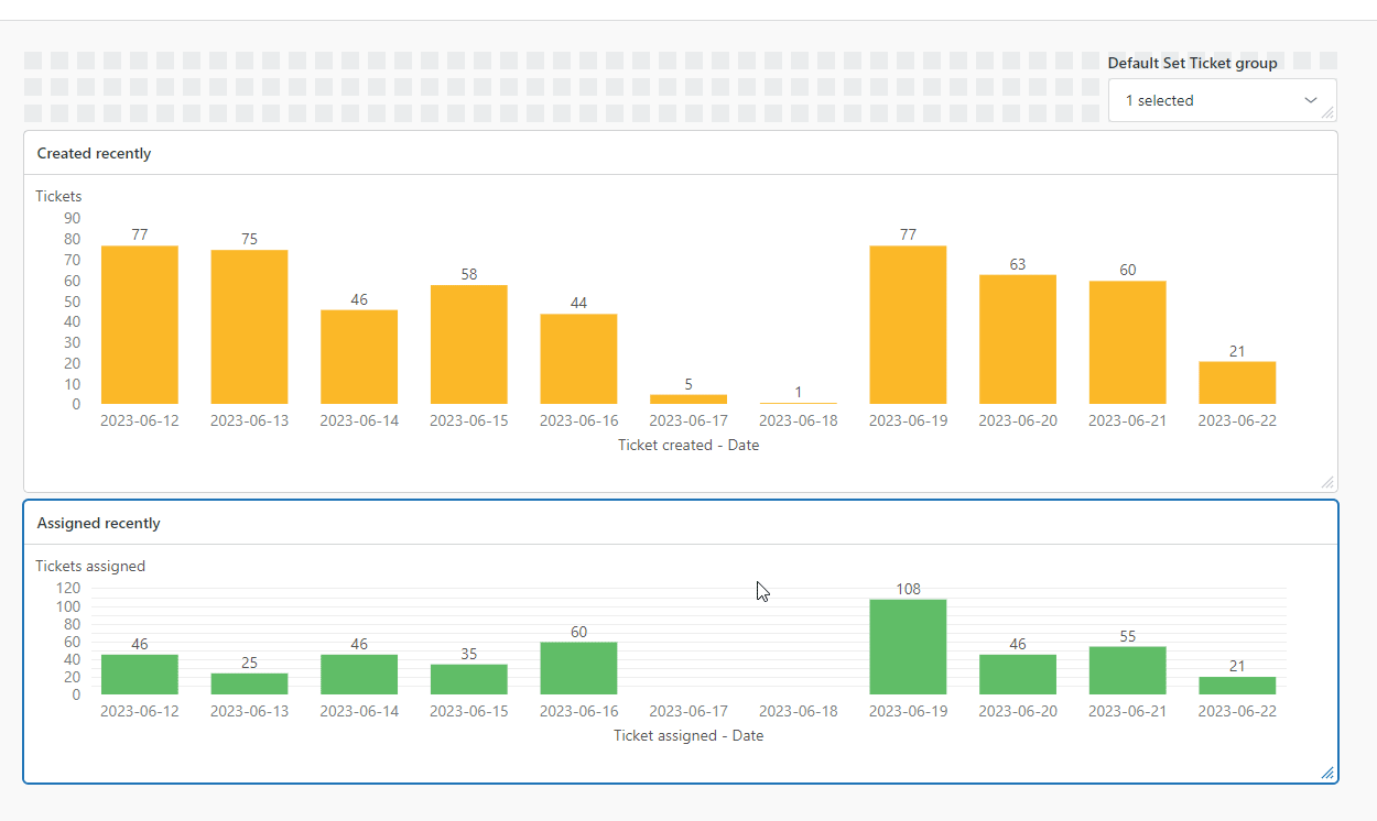 Putting two reports next to each other with the same date range is extremely useful to when the reports are related, and especially when the x-axis if for different attributes (e.g. ticket created vs assigned). However the comparisons breaks when a report viewer cannot compare columns between the reports, because some dates have 0 values and the "time axis" feature doesn't work.