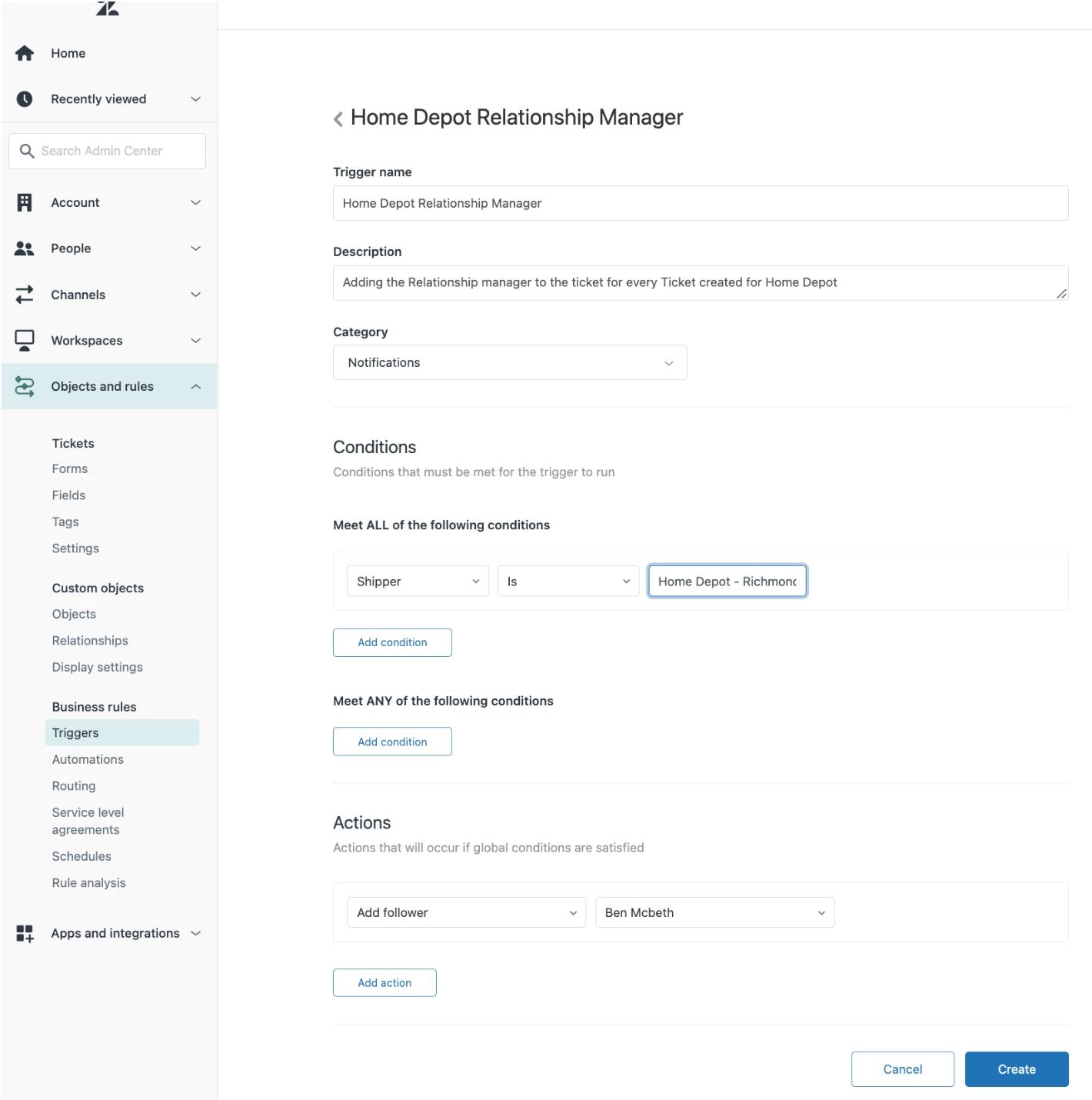 You can add Lookup fields as Conditions to a Trigger. For eg: I want to add Ben as a follower every time a ticket is created with the Shipper as Home Depot.