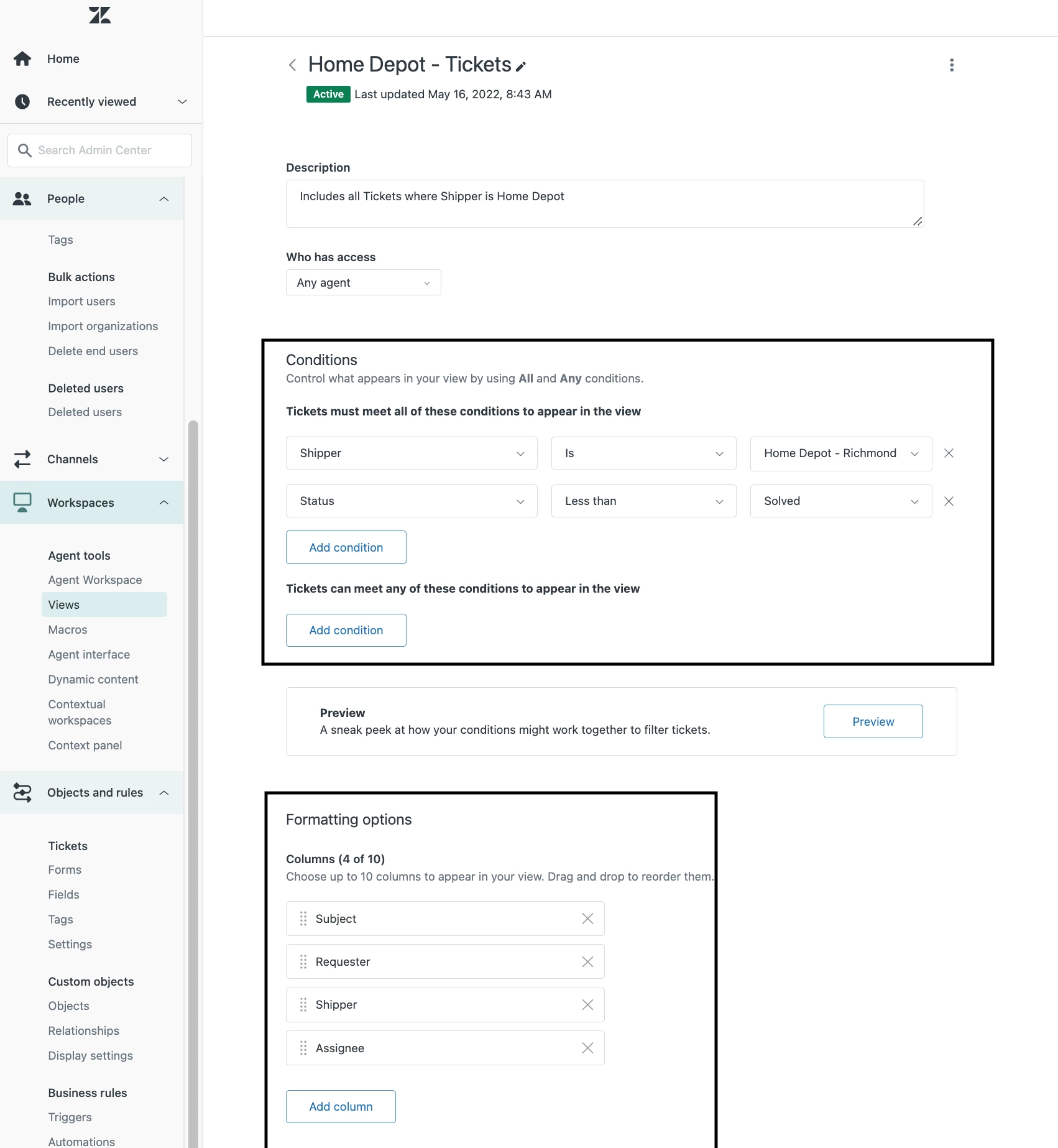 Once created, lookup fields in Ticket fields can be added to Views. They can also be added to conditions.