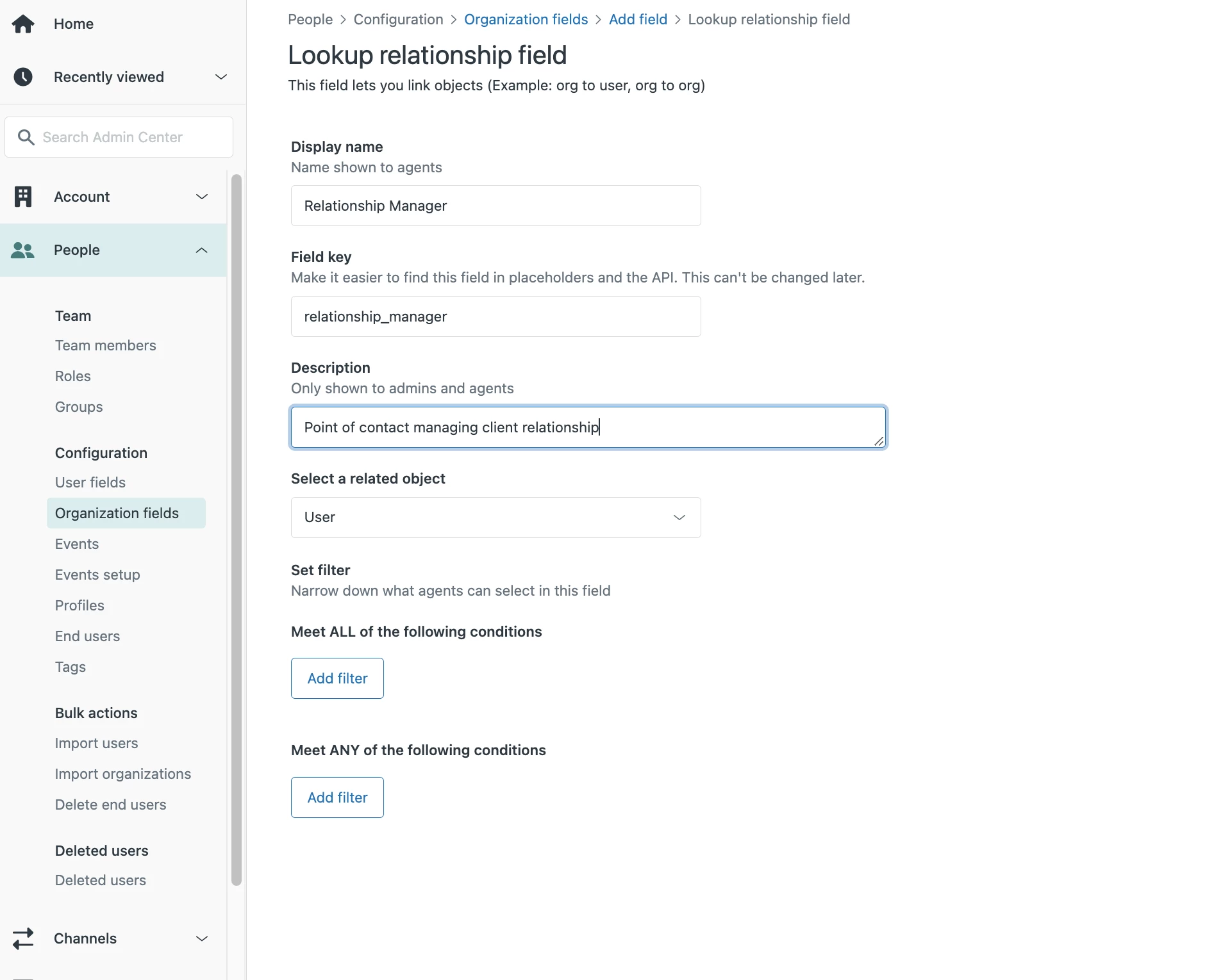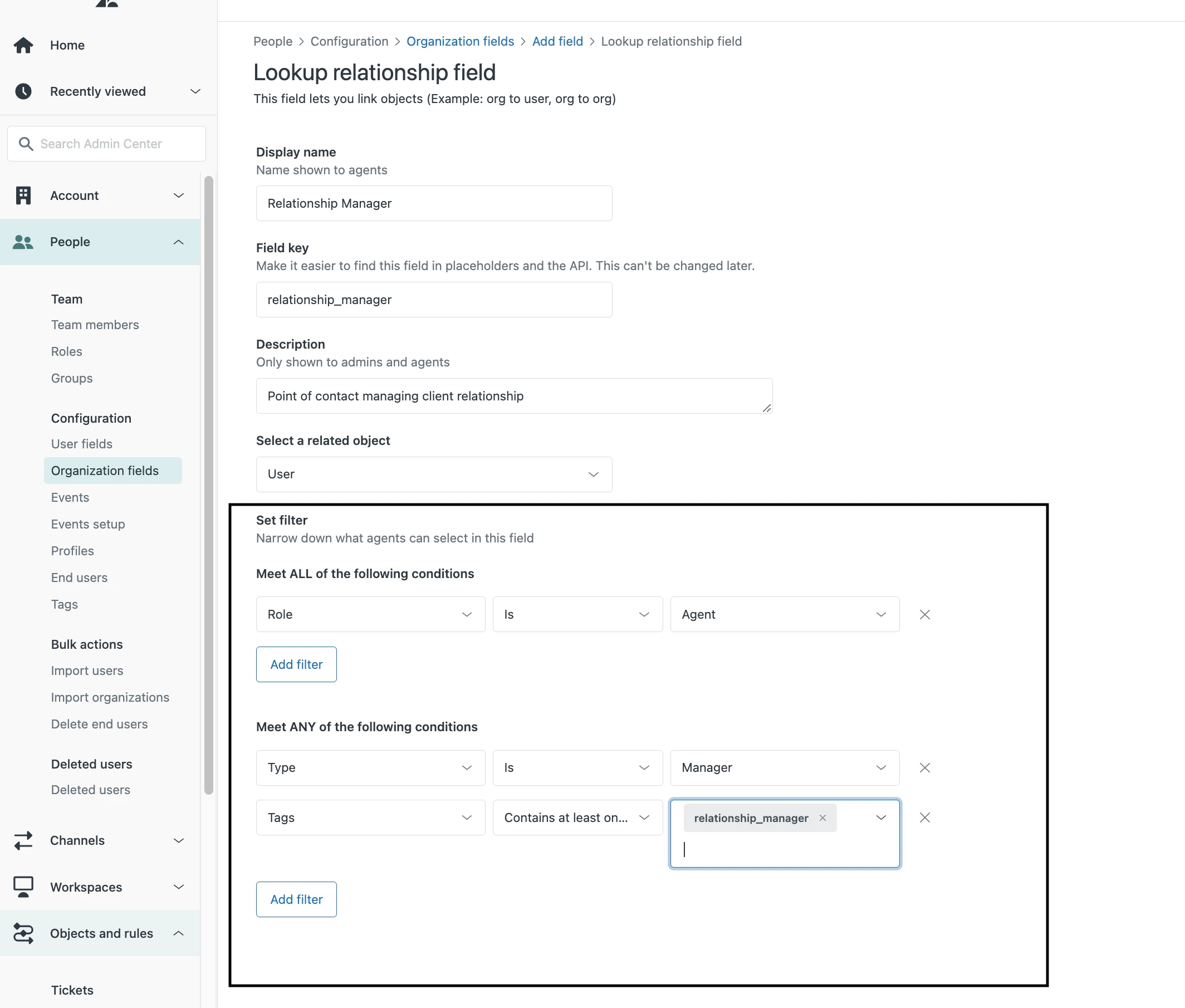 Admins can narrow down what values the agent can select in this field. For example, Let’s say you want the Relationship Manager to only be an Agent User with either the Type as Manager or having a Tag of Relationship Manager. You can define your filters when creating a Lookup Field