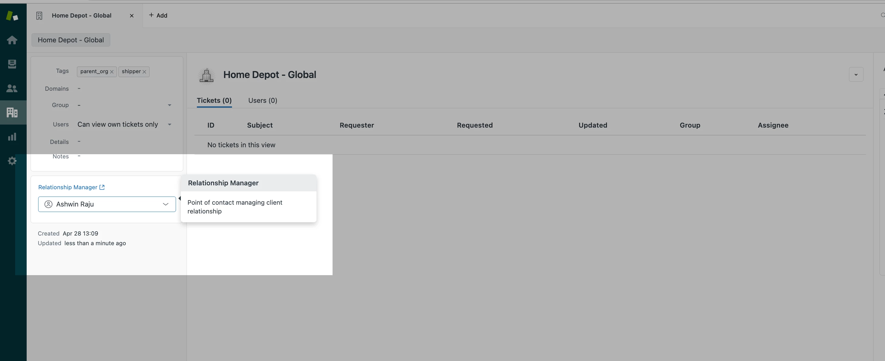 You will now see a new field called Relationship Manager in your Organizations, where you can add any User record. You will have the same capability with Ticket and User Fields as well.