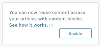 Content Blocks is currently in a closed EAP, and will be made broadly available as an open EAP for Guide Enterprise customers in July 2020.