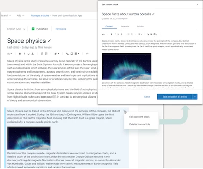 - Managing Content Block Blocks - Content blocks are centrally managed. That means that you can edit a content block by selecting Edit from the block’s menu. Once your changes are saved they will be automatically populated in all the articles that are reusing this block. If you want to edit a single instance of a content block you can choose the Unlink option which transforms it to a regular text. Once unlinked, edits to the block will not update other articles.
