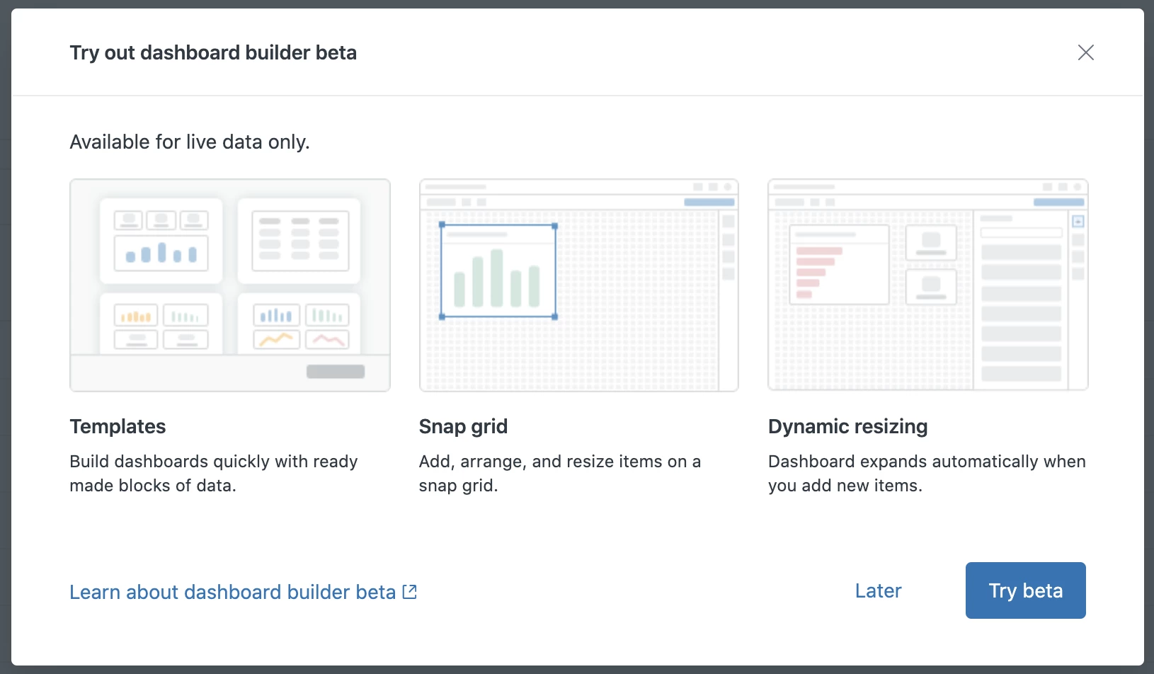 For this beta, we’ve limited this experience to live dashboards only. Any dashboards you’ve already created will not be affected.