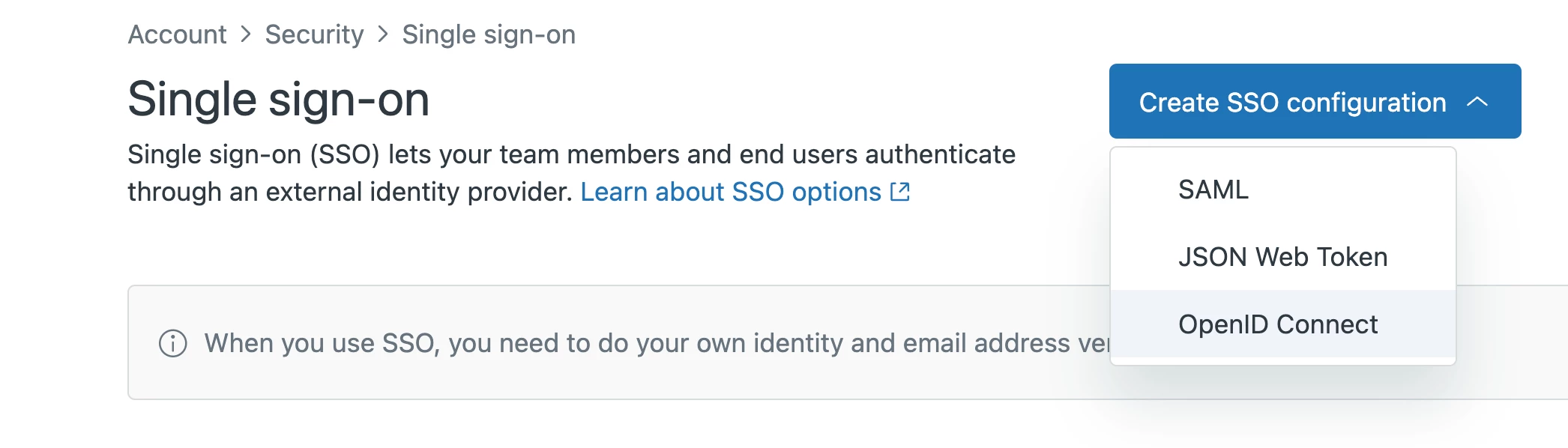 Once you've gotten the email confirmation that your account has been enrolled in the OpenID Connect EAP; you’ll see a new SSO configuration option for OpenID Connect under the Create SSO configuration dropdown. SSO configurations are created in Admin Center, under Account > Security > Single Sign-on.