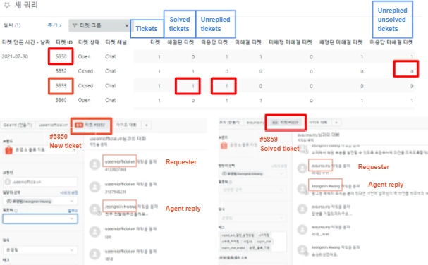 If you see ticket #5859 above chat image(right), definitely you could check 'agent reply' and 'solved status'. However, on the ticket date table(top image), #5859 is counted as an 'unreplied ticket' too.