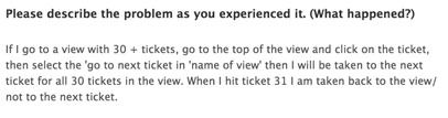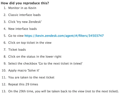 The middle describes steps used to replicate or reproduce the issue. Before listing the steps, advocates indicate any options available. Options include whether or not developers have explicit permission to access the customer's account or any ticket/forum/widget/view that produced the issue. We find that the more mystery there is in a ticket, the less likely it is to be solved quickly.