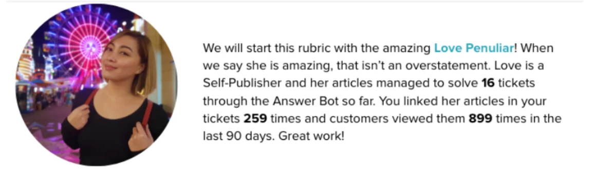 If we want agents to keep sharing their knowledge, rewards and recognition need to be front and center. We analyze Knowledge Capture activity, but we also look at other indicators, such as CTR in search results, page views, successfully served up by our answer bot. This data helps us understand if the authors are being successful at intercepting tickets.