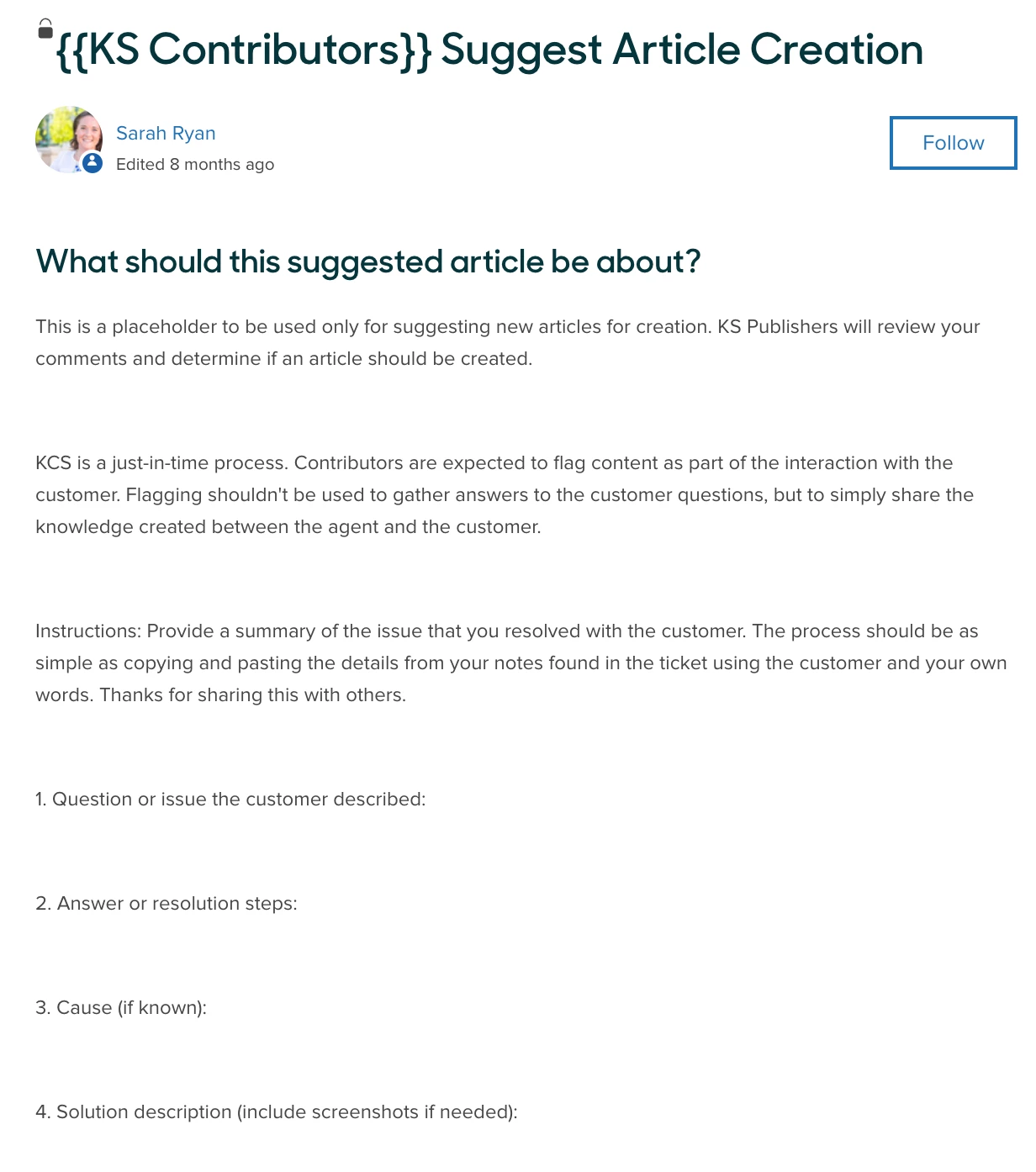 - A ticket is created in our KCS queue and a Knowledge Champion creates the article on their behalf. The Contributor is set as the author of the article so they can have recognition for their suggestions.