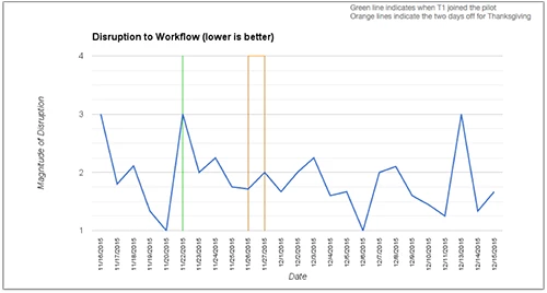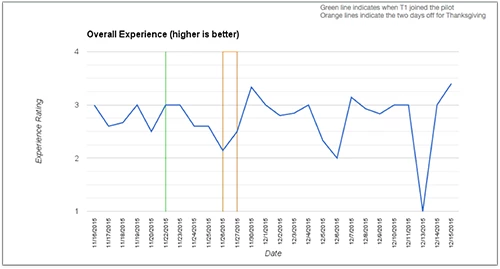 There was an initial trend of somewhat negative advocate experience ratings for the first two or three days of the pilot. However, once agents became more accustomed to the new workflow, the ratings turned around to be much more positive.