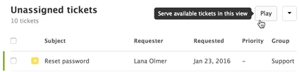 If you're not familiar with Play mode, it's a way for agents to work through the available tickets in a view automatically. In Play mode, agents press the Play button to open the first ticket in the view.