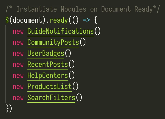 Some modules run inline, but our more complex modules load after the document ready event to prevent locking the page.  We merely need to instantiate a single new instance of each module in our webpack entry script and the modules handle the rest themselves: