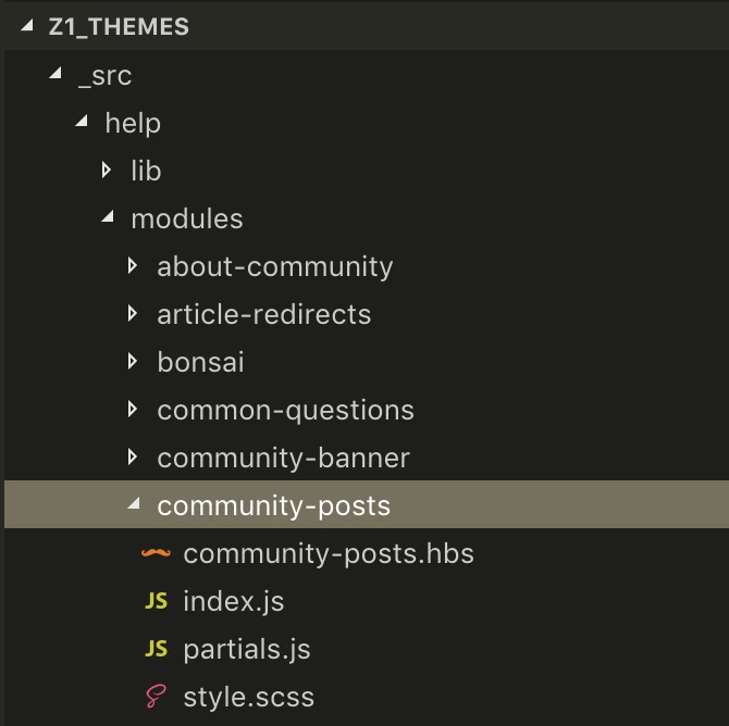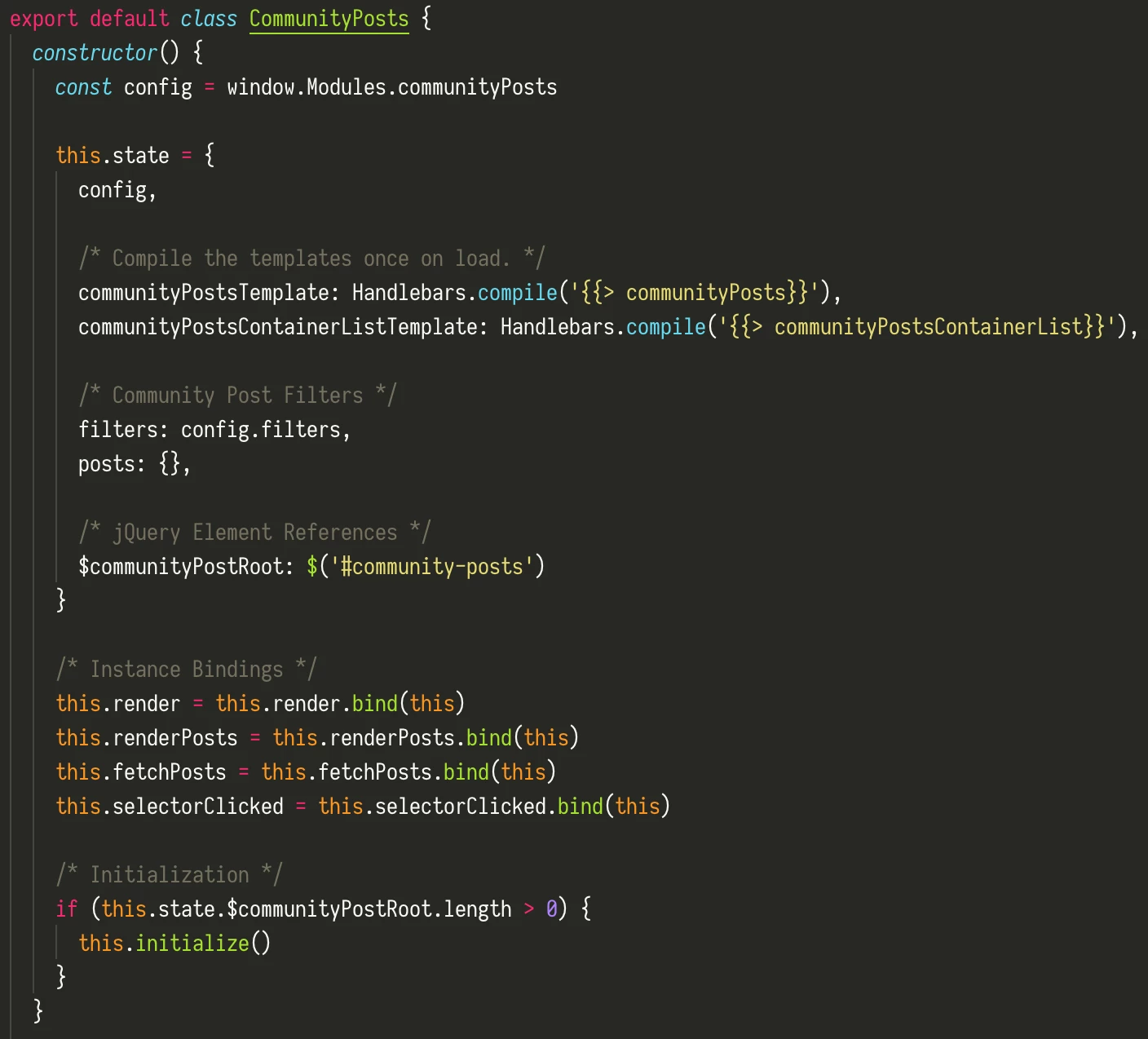 1. community-posts.hbs - contains Curlybars template code to be processed on the server side, the result of which will be output to the client’s browser.  This is where dynamic content strings and JSON blobs get dumped for the display modules to use on page load. It gets concatenated with all the other *.hbs files in the other modules to become to the footer.hbs file.