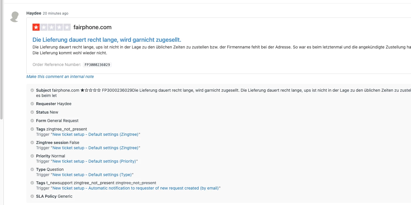 - I want to tag all new TrustPilot tickets with a TrustPilot_Reviews tag when they're created.- I want that the Email address & Reference (Order) Number in Trustpilot are added to these Zendesk tickets' account email address and order number field.