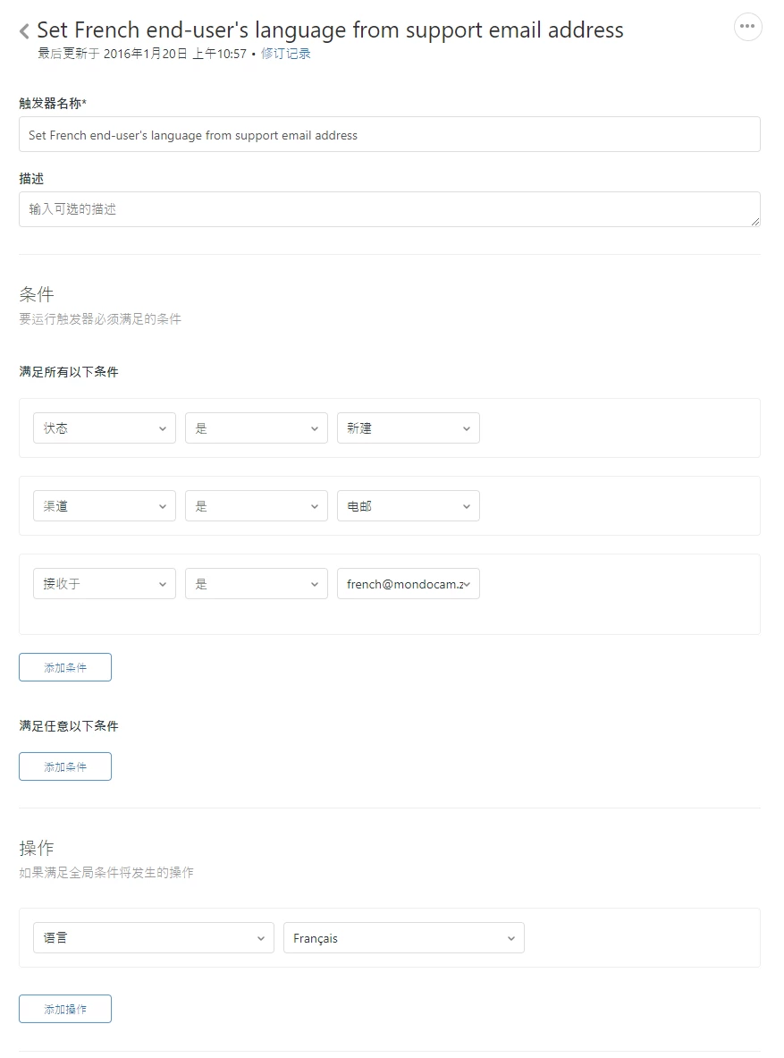 在这个例子中,z3nbugulator 使用 aide@bugulator.fr 这个电邮地址用于其法语的用户。此电邮地址将转发到 french@z3nbugulator.zendesk.com,也就是此触发器中使用的电邮地址。