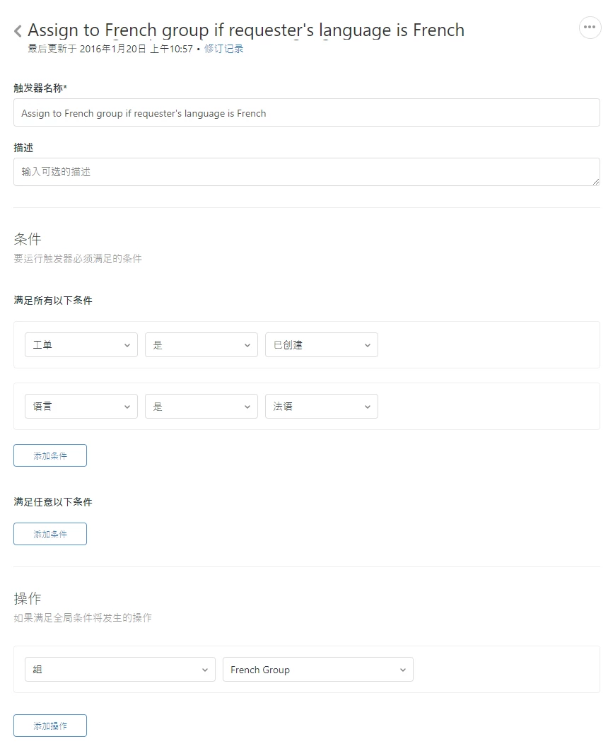 在这个例子中,来自法语用户的工单将自动分配给法语支持组。