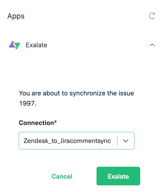 To see if the use case is working, go to your Zendesk instance and open the ticket you want to sync. Click on the “Apps” icon on the right side and click on the “Exalate” button. Select the connection you’ve just created from the list.