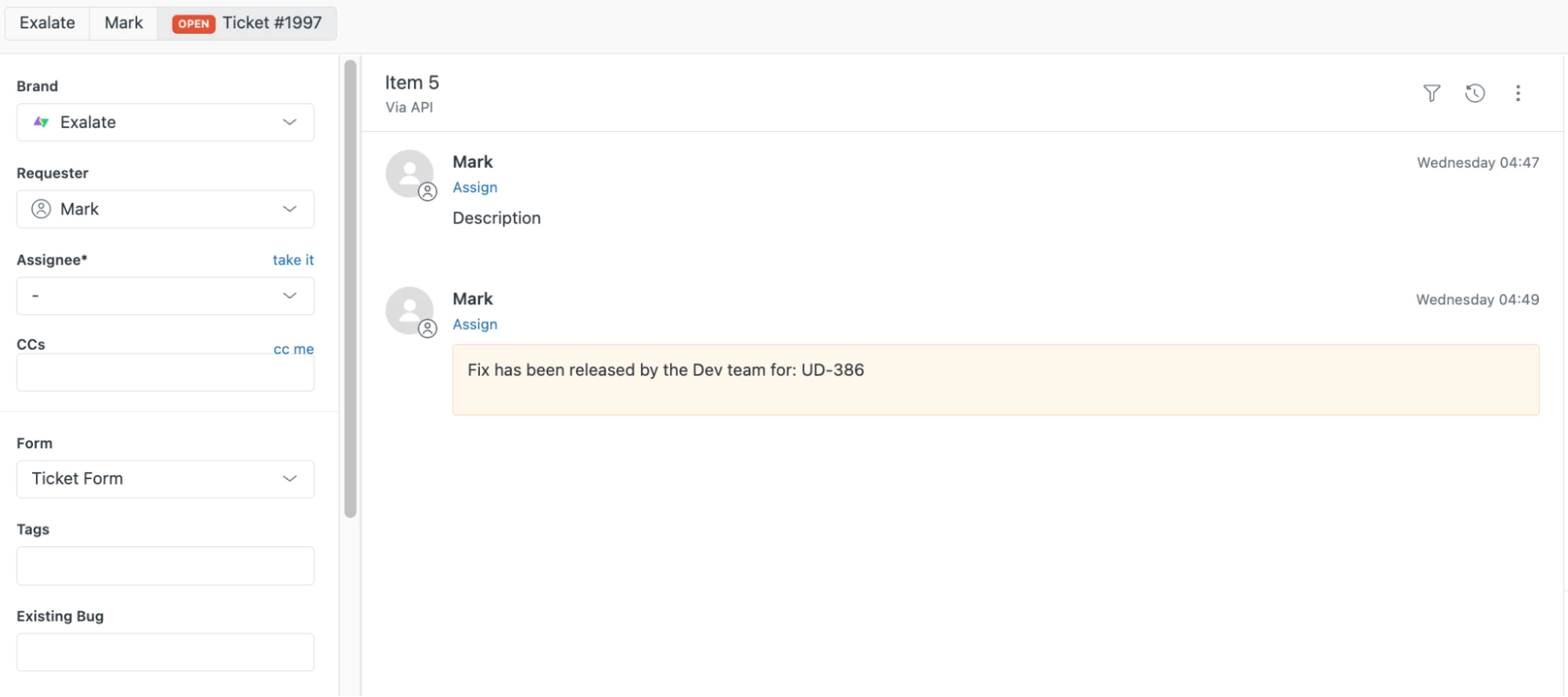 - When the issue is marked “Done” in Jira, a comment saying: “Fix has been released by the Dev team for UD-386” must be added to the private comments in Zendesk. Here, UD-386 is the Jira issue key.