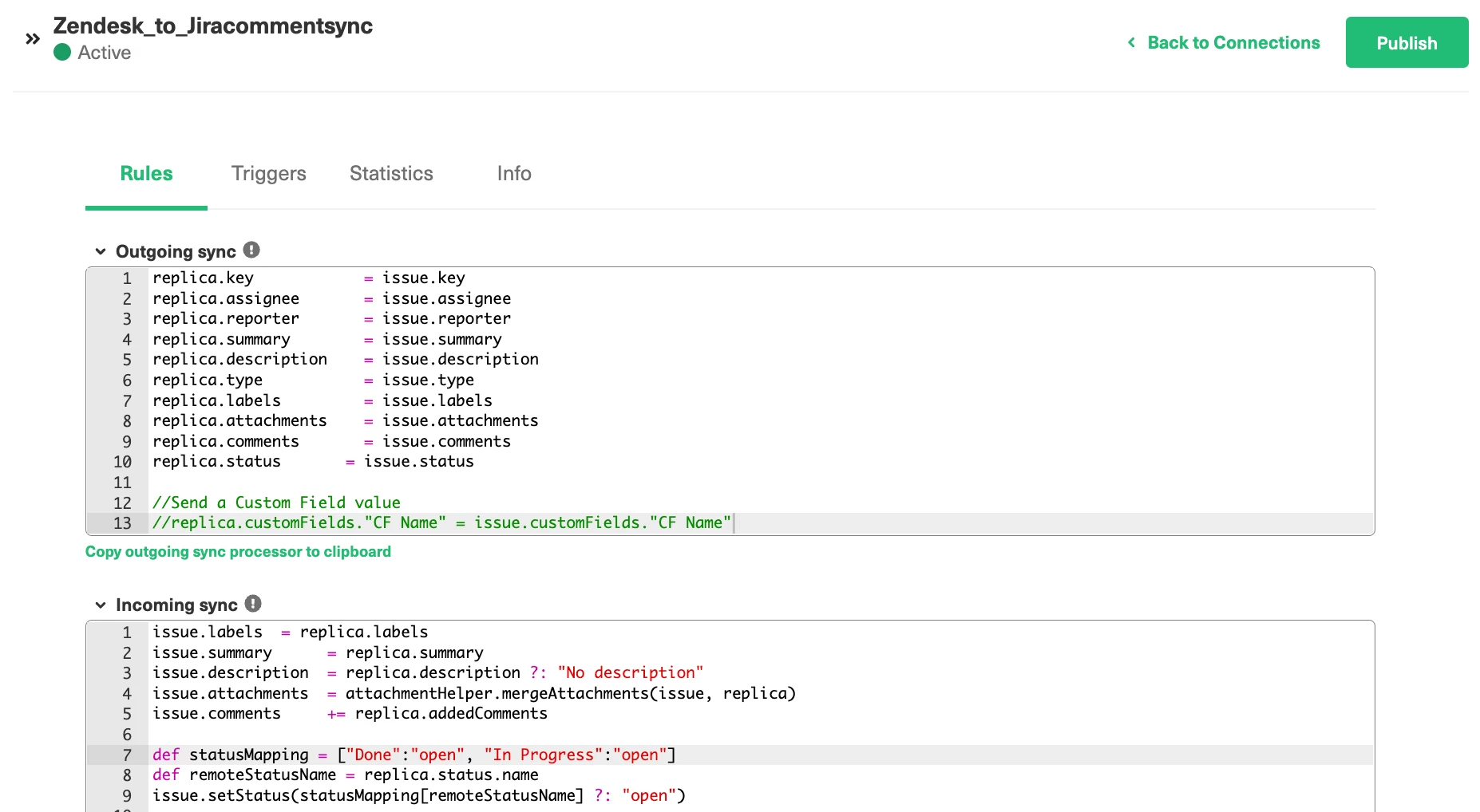 Navigate to the “Rules” tab in the Zendesk Exalate node and locate the “Incoming sync”.
