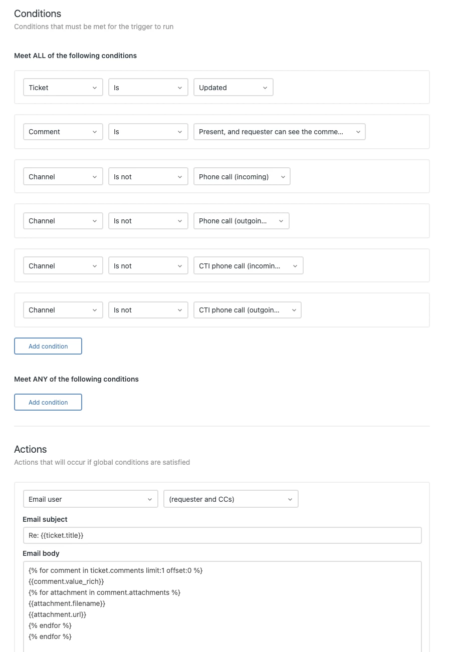 I looked at Events and found that a trigger was being hit, I believe it's just the native Zendesk "Notify requester of comment update". I thought I might add some conditions of the ticket not being Channels of phone calls, but it's still not working - can you help me from preventing Requesters of getting email alerts of phone calls.