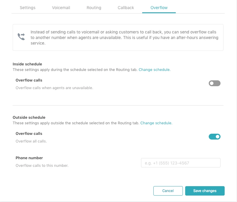 Please ensure you have Voicemail disabled for the Inside Schedule and/or Outside Schedule for the option that aligns with your desired workflow under the Voicemail tab in the Numbers settings from the above screenshot.
