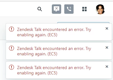 I constantly get error messages at the top-right corner of my screen saying: "Zendesk Talk encountered an error. Try enabling again. (EC5)"