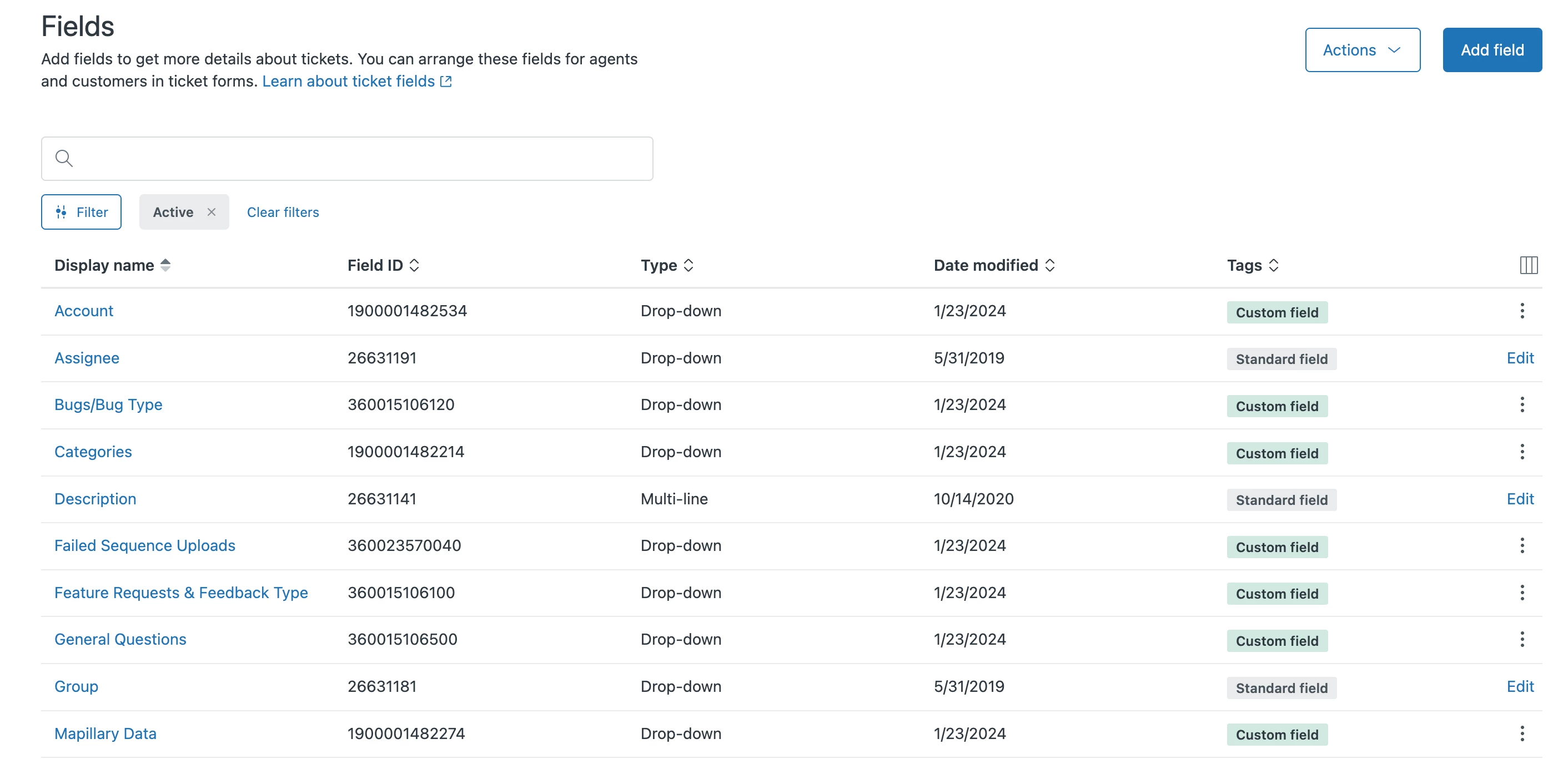 Right now, our Zendesk system has certain fields, and within each of those fields (categories) are sub-categories, which we use to organize incoming support emails.