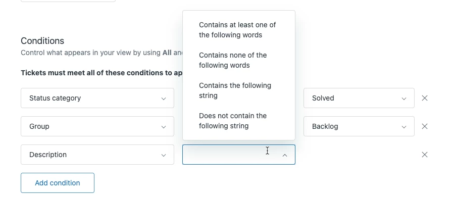 I am having trouble locating an answer. I would like to group certain tickets with certain descriptors into a view automatically once they come in. For example: all tickets from a specific end user or with a specific description. I have tried and am not quite getting results using views. Although my end user is listed, I can't add them as a requestor in the condition.